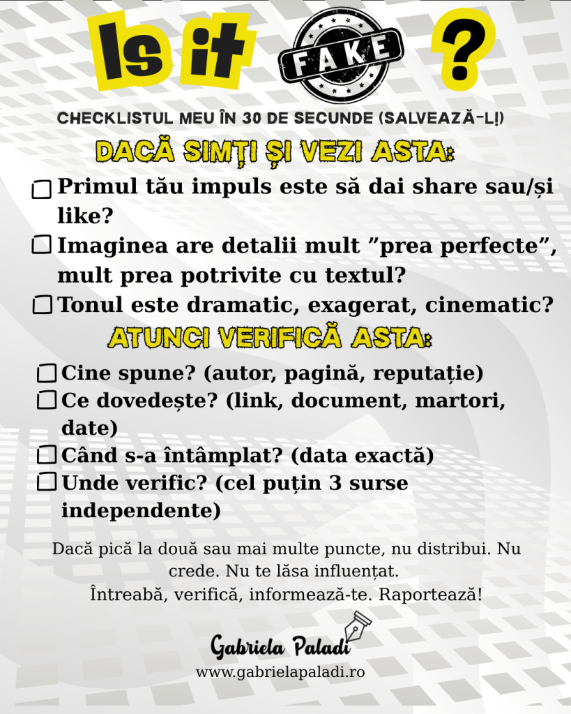 Îmi iubesc meseria pentru că aduce laolaltă creativitate, logică dar și emoție. Dar tocmai emoția este cea care ne face vulnerabili și creează impulsivitate, care la rândul ei duce spre percepții și decizii eronate. Un vizual puternic, două fraze lacrimogene, un final care promite catharsis și share-ul pleacă. Cea mai importantă frână pe care pot să o pun este curiozitatea: „De unde știu asta? Cine spune? Ce pot verifica în 30 de secunde?”.