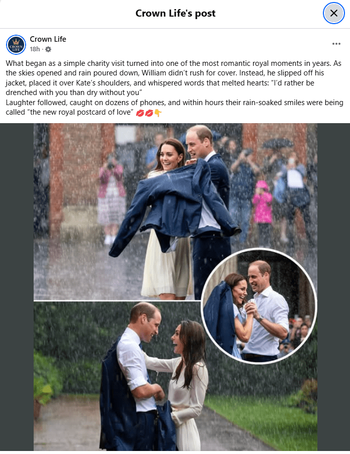 Ce promite postarea: un moment romantic surprins la o vizită publică – William își pune jacheta pe umerii lui Kate, zâmbete în ploaie, replici memorabile.